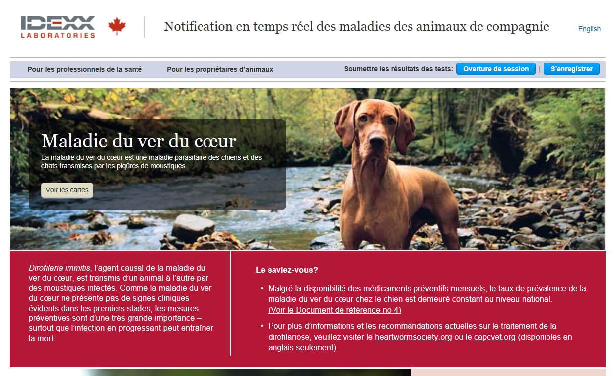 Voici un site qui contient de l’information sur différentes maladies comme la maladie de Lyme, Anaplasmose, Ehrlichiose, Ver du coeur et Leptospirose. Vous pouvez également consulter une carte géographique avec le nombre de résultats positifs pour chaque maladie par région.
