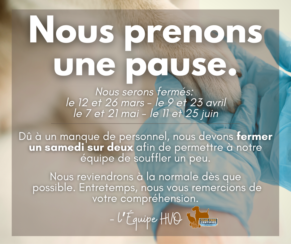 La qualité de notre service et de nos soins est toujours notre priorité, et en ce moment nous devons prendre soin de notre équipe afin qu’elle puisse continuer à prendre soin de vos animaux.