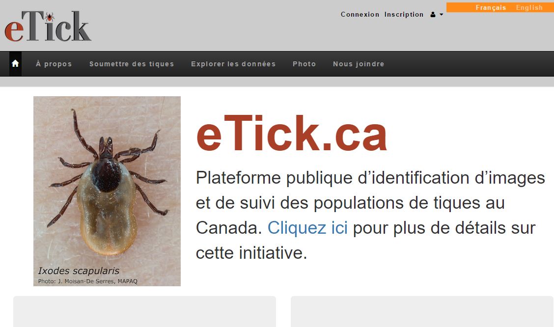 L’Université Bishop, en collaboration avec le Laboratoire de santé publique du Québec (LSPQ) et l’Agence de santé publique du Canada (ASPC), a lancé une plateforme publique d’identification d’images de tiques visant le suivi des populations de tiques au pays. Le projet de science citoyenne eTick.ca invite le public à s’impliquer dans le suivi des populations de tiques pour augmenter les connaissances sur leurs aires de distribution au Canada. Le projet permet aux personnes ayant prélevé une tique sur leur animal ou dans l’environnement d’en obtenir l’identification en faisant parvenir leur spécimen à l’Université Bishop à Sherbrooke et en téléchargeant une photo de la tique sur le site Web «eTick.ca». La plateforme représente une alternative pour l’identification de tiques, étant donné que le programme de surveillance passive des tiques du LSPQ a cessé en Montérégie en 2009. Veuillez noter que les spécimens de tiques envoyés dans le cadre de ce projet ne seront pas testés pour la présence de pathogènes (comme par exemple pour la bactérie responsable de la maladie de lyme). Les résultats d’identification des tiques, combinés à ceux de leur date et lieu de collecte, apparaissent ensuite sur une carte, de façon à ce que tous les utilisateurs puissent visualiser rapidement toutes les soumissions pour une ou plusieurs espèces, et ce, pour la région et/ou l’année de leur choix. L’accès à la plateforme est entièrement gratuit et il n’est pas nécessaire de contribuer à la soumission de photo pour consulter les données. N’hésitez pas à consulter le site suivant pour savoir comment participer, pour connaître les instructions pour la prise de photos, ou pour plus de détails sur cette initiative: https://www.etick.ca/